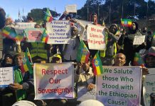 وحمل المتظاهرون لافتات كتب عليها “التهديد لإثيوبيا خطر على العالم”، و”يجب احترام سيادة إثيوبيا”.، بالإضافة إلى لافتات أخرى تحمل كلمات تتهم الولايات المتحدة بعدم احترام سيادة إثيوبيا، وفق وسائل إعلام محلية.