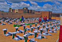وشملت المشاعدات المقدمة، كميات من الأرز، والسكر، وزيت الطهي، وناموسيات، إضافة للصابون، والأغطية، والأفرشة، ومعدات حفظ المياه، وأدوات زراعية.