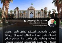 “إخوتي وأخواتي، أهنئكم بحلول شهر رمضان المبارك، راجيًا من الله العلي القدير أن يوفقنا لصيامه وقيامه، وأن يتقبل منا ومنكم صالح الأعمال، وأن يعيده علينا بموفور الصحة والعافية.”