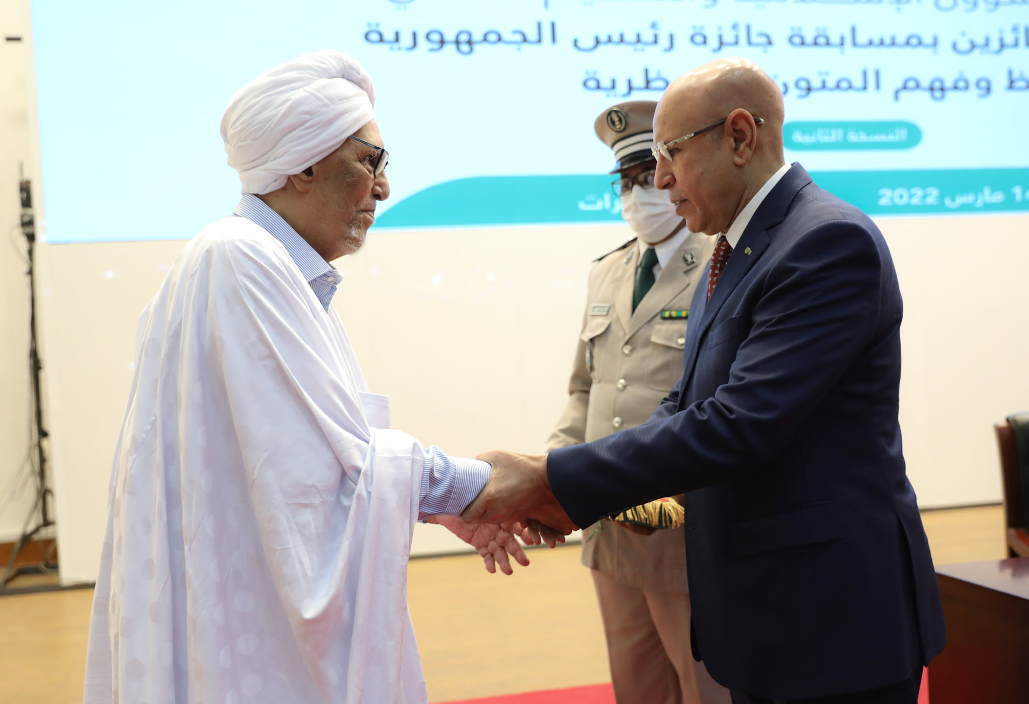على هامش حفل توزيع جوائز مسابقة المتون المحظرية في المركز الدولي للمؤتمرات بنواكشوط، وشح الرئيس محمد ولد الشيخ الغزواني، العلامة محمد المختار ولد اباه بوسام كوماندور في نظام الاستحقاق الوطني.